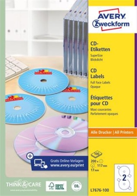 Etikett, CD/DVD, 117 mm, AVERY ZWECKFORM, 200 etikett/csomag